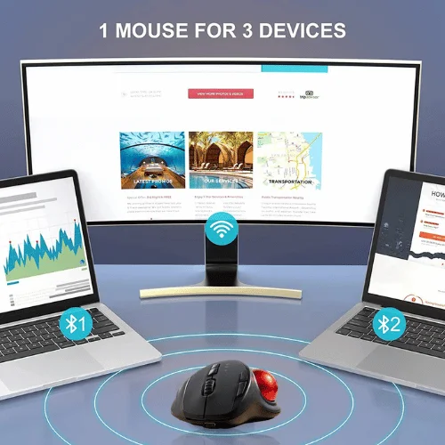 La JOMAA Souris sans fil à boule de défilement 2400 DPI rechargeable ergonomique pour PC et ordinateur portable propose une double connectivité 2.4G via récepteur USB et Bluetooth (BT1 + BT2), permettant de connecter plusieurs appareils et de basculer facilement entre eux.