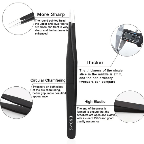 Le Ruiheng 9PCS Kit pince à épiler en acier inoxydable ESD noir antistatique pour réparation électronique est conçu pour les techniciens spécialisés dans la réparation de téléphones, montres électroniques et travaux BGA en Côte d’Ivoire. Ce kit professionnel offre précision et sécurité grâce à son traitement antistatique ESD.
